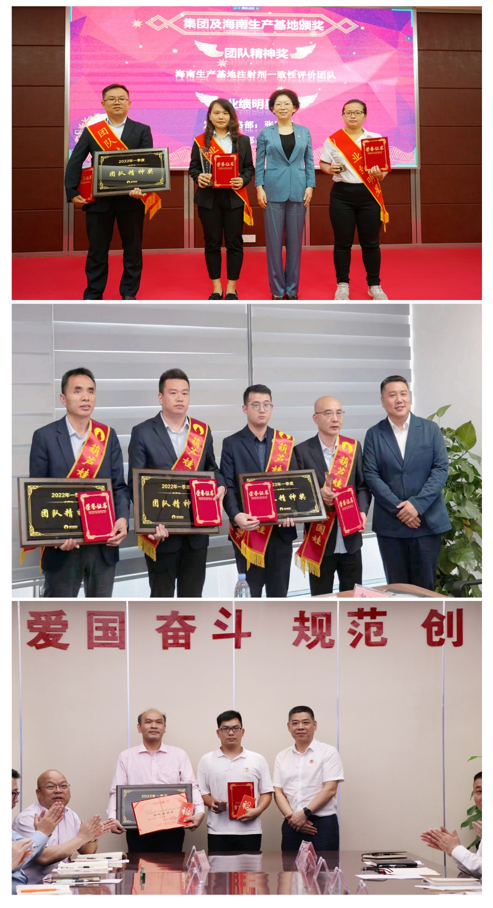 2022年5月5日,在海南省第八次党代会闭幕后的第一个工作日,z6mg人生就是博药业集团在海口集团总部、杭州营销中心、广西生产基地通过视频召开一季度总结表彰会,迅速传达学习贯彻落实省第八次党代会精神,研究部署接下来的工作。集团总部、营销中心、海南生产基地、广西生产基地、研发团队等经理级以上管理干部75人及获奖代表参加会议。