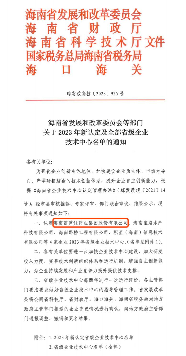 近日,海南省发改委等多部门联合公布了《关于2023年新认定及全部省级企业技术中心名单的通知》,其中,海南z6mg人生就是博药业集团股份有限公司成功通过评审,被认定为省级企业技术中心,是本次获批的4家企业之一。